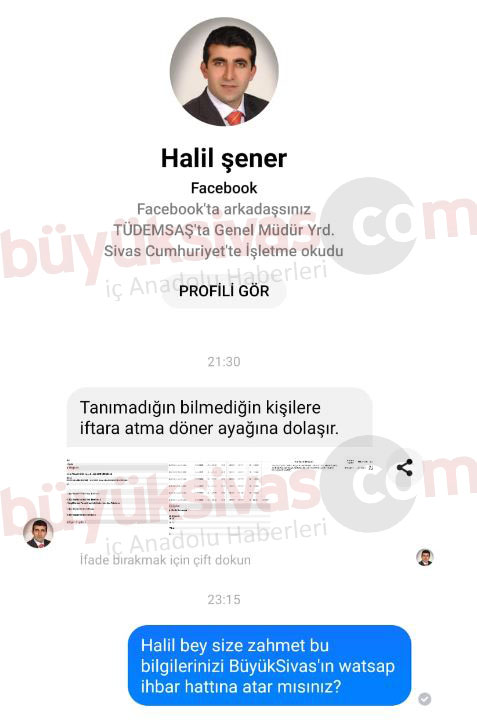 Daha önce yayınladığımız bazı üstü kapalı haberleri de üzerine alınarak "bu sanırım benim" diyen Türasaş Müfettişi Halil Şener, Büyük Sivas Yazı İşleri Müdürümüz Cemil Duymaz'a sosyal medya hesabı üzerinden ulaşarak "Tanımadığın bilmediğin kişilere iftira atma döner ayağına dolaşır" mesajını attı.