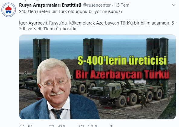 Konu ile ilgili sosyal medyadan paylaşımda bulunan Rusya Araştırmaları Enstitüsü de "S400’leri üreten bir Türk olduğunu biliyor musunuz? Aşurbeyli, Rusya’da köken olarak Azerbaycan Türk'ü bir bilim adamıdır. S-300 ve S-400'lerin üreticisidir" denildi.