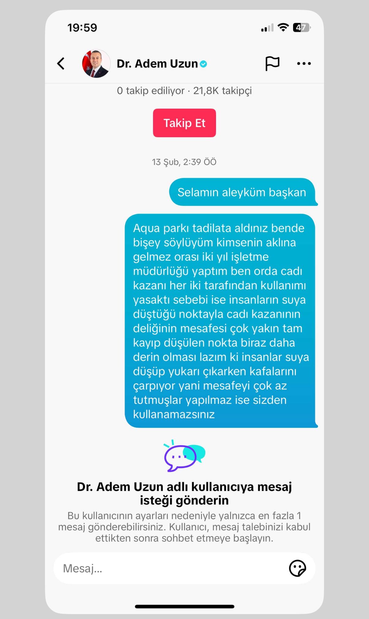 - “Cadı kazanı kaydırağının çıkış deliği ile havuz yüzeyi arasındaki mesafe çok kısa. Ziyaretçiler suya düştükten sonra başlarını yeterince derin olmayan havuz tabanına veya kenara çarpabiliyor. Bu risk nedeniyle slaytın her iki taraftan kullanımı geçmişte yasaktı. Tadilat başlarken bu mesafenin artırılması gerektiğini raporlu şekilde Belediye Başkanı Adem Uzun’a ilettim, ancak uygulamaya alınmadı.”*