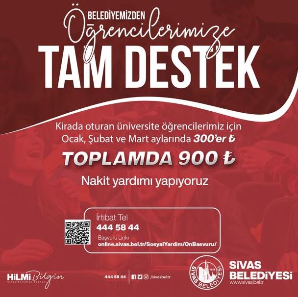 Üniversite öğrencilerine yönelik de nakit yardımı yapılacağını dile getiren Bilgin, “Gönül Belediyeciliğimiz gereği ilimize misafir olarak gelen ve öğrenci evlerinde kalan öğrencilerimize yönelik bir paket hazırladık. Biliyorsunuz Sivas bir üniversite şehri, Allah'a şükürler olsun Sivas'ta yurt sorunu yok. Devletimizin şehrimize kazandırdığı yurtlarla birlikte Sivas'a gelen öğrencilerimiz otel konforundaki yurtlarda kalıyor. Ama çeşitli sebeplerle, kendi özel durumları veya farklı nedenlerden dolayı öğrenci evlerinde kalan üniversiteli öğrencilerimize de Sivas'ın misafirperverliğini göstermek istedik. Genç ve öğrenci dostu bir belediye olarak onlara da yardımda bulunmak adına yine aynı kapsamda bir projeyi hayata geçiriyoruz. En az 3 öğrenci ikamet eden öğrenci evlerine Sivas merkezde ikamet etmeleri şartı ve örgün eğitime devam ediyor olmaları şartıyla, öğrenci belgeleri, ikamet belgeleri gibi istenen bilgileri sisteme yükledikleri takdirde Ocak, Şubat ve Mart aylarında 300’er TL yakacak yardımında bulacağız.” dedi.