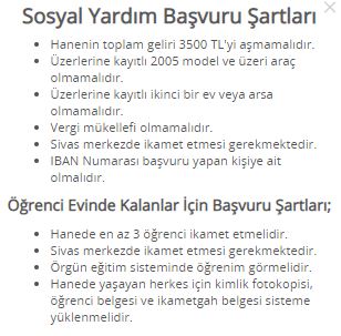 Başvuru şartlarından da bahseden Bilgin, “Hanenin toplam geliri 3 bin 500 TL'yi aşmamalıdır. Üzerine kayıtlı 2005 model ve üzeri araç olmamalıdır. Üzerlerine kayıtlı ikinci bir ev veya arsa olmamalıdır. Bir ev var ancak geliri 3500 TL'yi geçmiyorsa sosyal yardımdan faydalanabilecekler. Vergi mükellefi olmamaları ve Sivas merkezde ikamet etmesi gerekmektedir. Ayrıca bize bildirdiği hesap numarasının da kişinin kendisine ait olması gerekmektedir. Belediyemiz internet sitesine girdikleri takdirde ilk başta ekrana düşecek ve bu şartları taşıyanlar müracaat edecekler. Hiçbir hemşerimiz belediyemize kadar yorulmadan müracaatlarını yaptırdıkları takdirde hem bir yoğunluk oluşmayacak, hem de hızlı bir şekilde başvurularını yapmış olacaklar. Bu projemizden faydalanacak olan tüm hemşerilerimize hayırlı uğurlu olsun diyorum.” dedi.