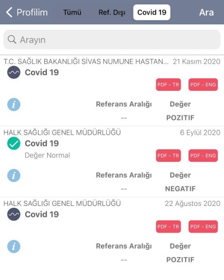 Vatandaşın attığı ekran görüntüsünde ilk pozitif testin 22 Ağustos tarihinde çıktığı görülürken 6 eylül tarihinde yaptırdığı testin negatife dönerek iyileştiği gözlendi.