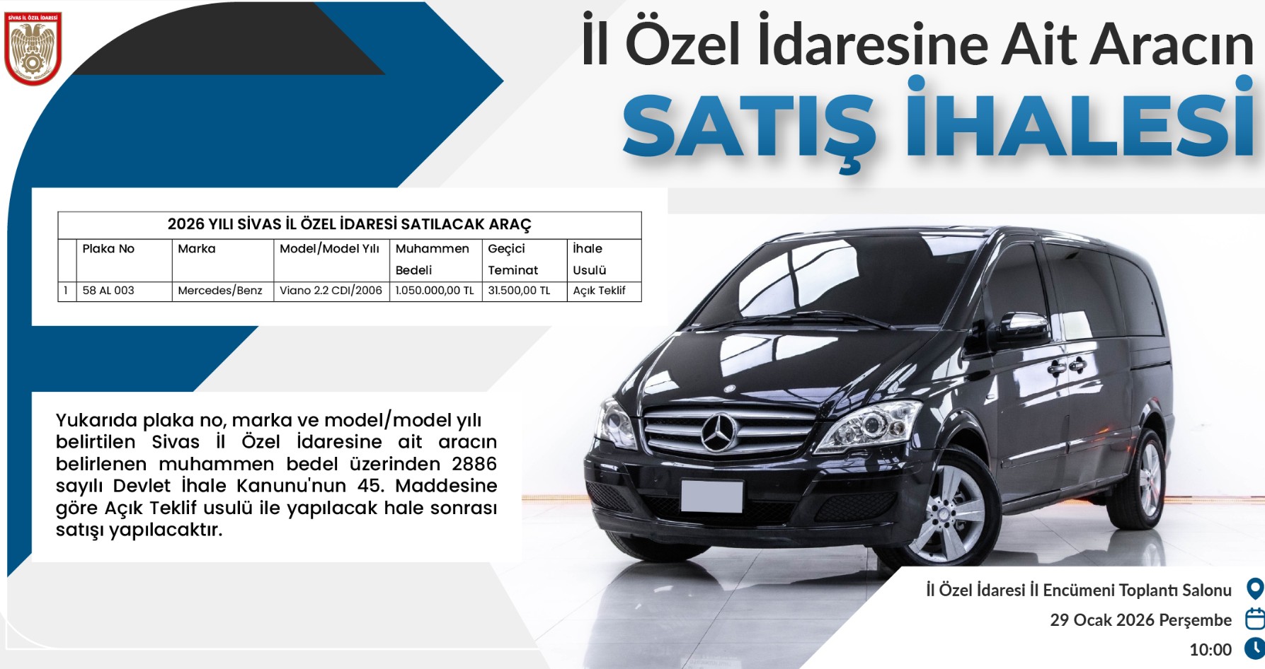 İl Özel İdaresi tarafından yayımlanan ihale duyurusunda, satışa konu aracın Mercedes-Benz marka, Viano 2.2 CDI model ve 2006 model yılına ait olduğu belirtildi. 58 AL 003 plakalı aracın muhammen bedeli 1 milyon 50 bin TL olarak açıklanırken, geçici teminat bedelinin ise 31 bin 500 TL olduğu bildirildi.