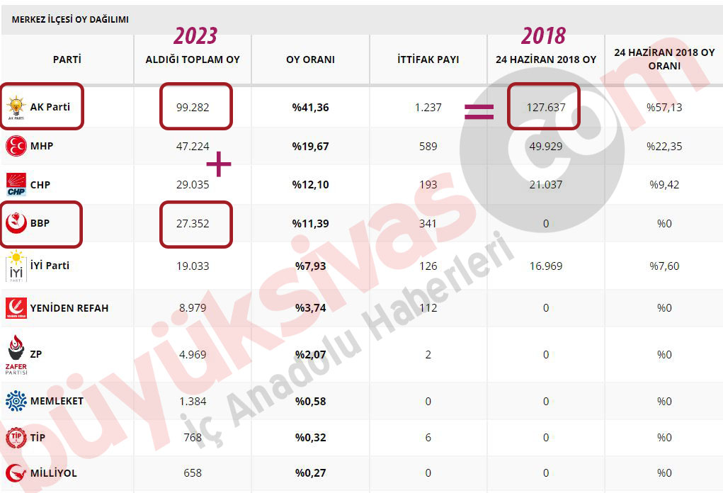 En son 2023 seçimlerinde Sivas Merkez de AK Parti 99 bin oy alırken bu sayı 2018 yılında AK Parti ve BBP'nin toplamında 128 bindi.