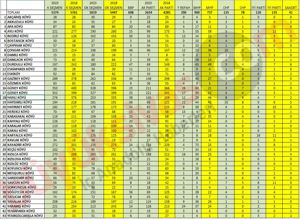 2018 VE 2023 SEÇİMLERİ İLBEYLİ KÖYLERİ OYLAR