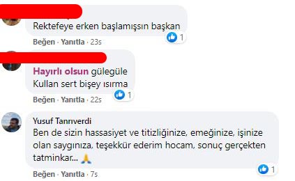 Başkan Tanrıverdi ise yapılan bu yorumlara "Ben de sizin hassasiyet ve titizliğinize, emeğinize, işinize olan saygınıza, teşekkür ederim hocam, sonuç gerçekten tatminkar... " karşılığını verdi.