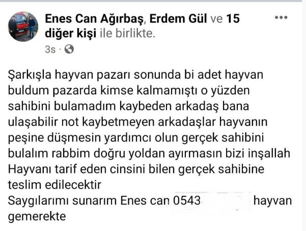 Bulduğu danayı gerçek sahibine teslim eden Enes Can Ağırbaş, insanlık görevini yerine getirdiğini söyleyerek, “Sivas’ın Gemerek ilçesinde büyükbaş hayvan alım satımı yapıyorum.