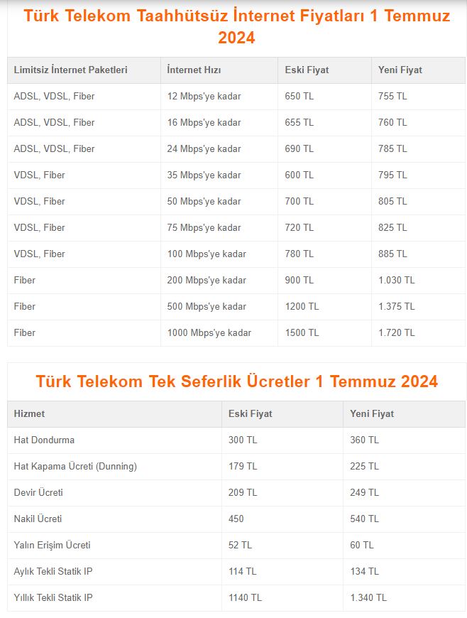 Türk Telekom tarafından yayınlanan yeni zamlı tarifelere göre, en düşük taahhütsüz ve limitsiz internet paketi olan "12 Mbps’ye kadar" internet paketinin fiyatı 650 TL’den 755 TL’ye kadar yükseltilecek.
