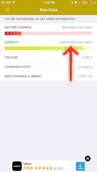 Aşağıdaki ekran görüntüsünde görebileceğiniz gibi, iPhone 7 Plus pil kapasitesi 2,600 mAh, orijinal 2,900 mAh'lik pil kapasitesinin% 90'nından biraz daha düşük.
