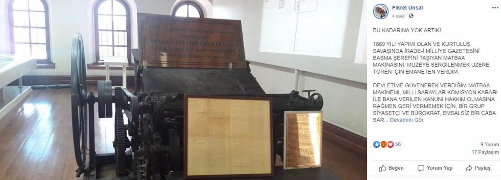 Devletime güvenerek verdiğim matbaa makinemi, milli saraylar komisyon kararı ile bana verilen kanuni hakkım olmasına rağmen geri vermemek için, bir grup siyasetçi ve bürokrat, emsalsiz bir çaba sarf etmektedir.