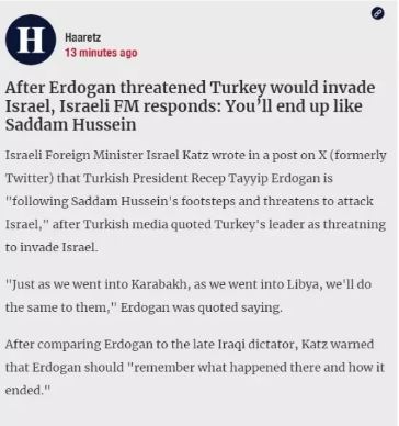"İsrail Dışişleri Bakanı Israel Katz, Türk medyasının Türkiye liderini İsrail'i işgal etmekle tehdit etmesinin ardından X hesabı üzerinden yaptığı paylaşımda Türkiye Cumhurbaşkanı Recep Tayyip Erdoğan'ın "Saddam Hüseyin'in izinden gittiğini ve İsrail'e saldırmakla tehdit ettiğini" yazdı.