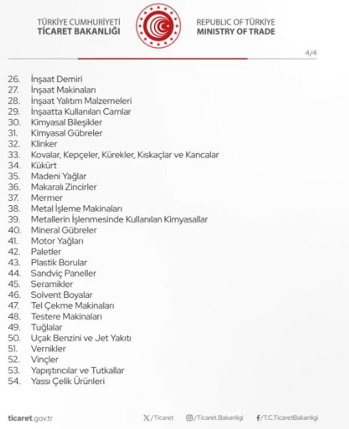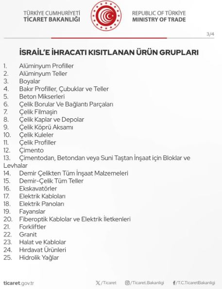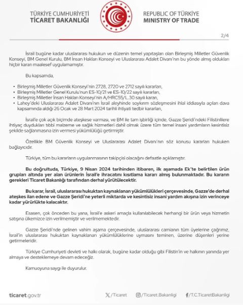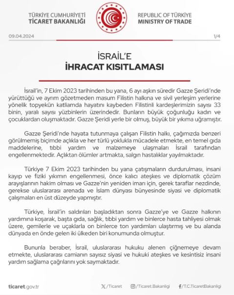 Ticaret Bakanlığı tarafından yapılan açıklamada : "Türkiye, 9 Nisan 2024 tarihinden itibaren, ilk aşamada Ek’te belirtilen ürün grupları altında yer alan ürünlerin İsrail’e ihracatını kısıtlama kararı almış bulunmaktadır. Bu kararın gerekleri Ticaret Bakanlığı tarafından derhal yürütülecektir. Bu karar, İsrail, uluslararası hukuktan kaynaklanan yükümlülükleri çerçevesinde, Gazze’de derhal ateşkes ilan edene ve Gazze Şeridi’ne yeterli miktarda ve kesintisiz insani yardım akışına izin verinceye kadar yürürlükte kalacaktır." ifadelerine yer verildi.