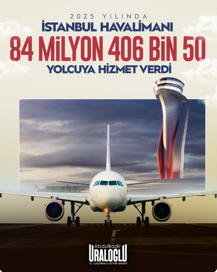 Bakan Uraloğlu’nun paylaştığı bilgilere göre, İstanbul Havalimanı 2025 yılı boyunca toplam 549 bin 316 uçuşa ev sahipliği yaptı. Aynı dönemde havalimanını kullanan yolcu sayısı ise 84 milyon 406 bin 50 olarak kayıtlara geçti. Bu verilerle İstanbul Havalimanı, küresel ölçekte havacılık sektörünün en yoğun merkezlerinden biri olma konumunu korudu.