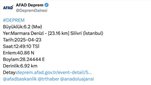 “İstanbul Marmara Denizi Silivri’de 6,2 büyüklüğünde bir deprem meydana gelmiştir. Çevre illerden de hissedilen depremle ilgili olarak, AFAD ve ilgili kurumlarımızın tüm ekipleri saha taramalarına başlamıştır. Depremden etkilenen vatandaşlarımıza geçmiş olsun dileklerimi sunuyorum. Allah ülkemizi ve milletimizi afetlerden korusun.”