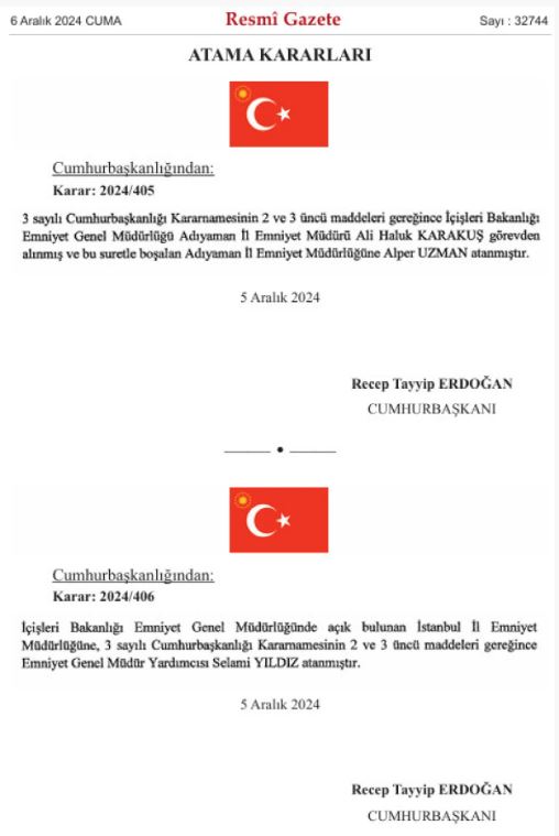 Cumhurbaşkanı Recep Tayyip Erdoğan'ın imzasıyla Resmi Gazete'de yayımlanan atama kararlarına göre İstanbul ve Adıyaman İl Emniyet Müdürlüklerine yeni isimler atandı.