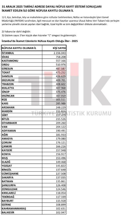 Listede İstanbul nüfusuna kayıtlı 2 milyon 156 bin 43 kişi ilk sırada bulunurken, Sivaslılar 758 bin 208 kişi ile dikkat çeken bir büyüklüğe ulaştı. Sivas’ı sırasıyla Kastamonu, Ordu, Giresun ve Tokat nüfusuna kayıtlı vatandaşlar izledi.
