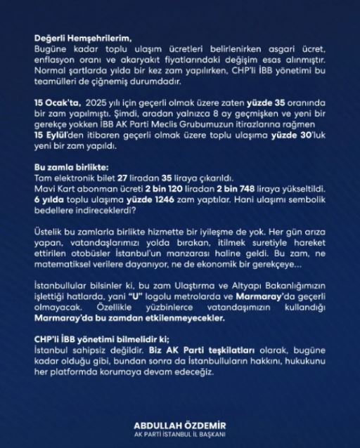 AK Parti İstanbul İl Başkanı Abdullah Özdemir, sosyal medya hesabından yaptığı açıklamayla İstanbulluları bilgilendirdi. Özdemir, “Değerli Hemşehrilerim, bugüne kadar toplu ulaşım ücretleri belirlenirken asgari ücret, enflasyon oranı ve akaryakıt fiyatlarındaki değişim esas alınmıştır. Normal şartlarda yılda bir kez zam yapılırken, CHP’li İBB yönetimi bu teamülleri de çiğnemiştir. 15 Ocak’ta, 2025 yılı için geçerli olmak üzere yüzde 35 oranında zam yapılmıştı. Aradan yalnızca 8 ay geçmişken yeni bir gerekçe olmaksızın 15 Eylül’den itibaren yüzde 30’luk bir zam daha uygulandı” dedi.