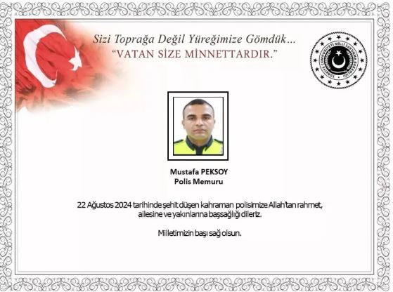 Açıklamada, şehit polis memuru Peksoy için yarın saat 10.00'da İstanbul Emniyet Müdürlüğü Vatan Yerleşkesi'nde tören düzenleneceği kaydedildi.