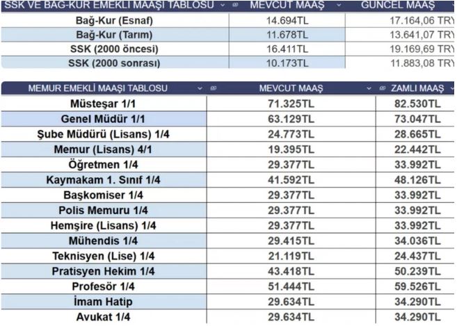 Memur ve memur emeklileri için ise 7. Dönem Toplu Sözleşme hükümleri gereği 2025 yılının ilk yarısında %6’lık zam oranı uygulanacak. Buna enflasyon farkı da eklendiğinde, olası zam oranları şu şekilde sıralanıyor: