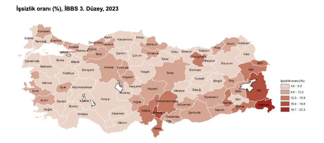 Buna göre, Türkiye genelinde, 2023 yılı için işsizlik oranı yüzde 9,4 olarak tahmin edildi. İşsizlik oranı en yüksek il yüzde 23,3 ile Hakkari iken, işsizlik oranı en düşük il yüzde 4,8 ile Sinop oldu.