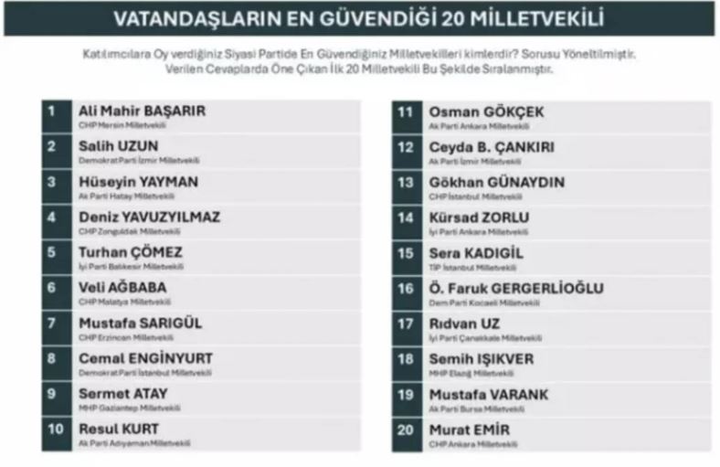 ORC Araştırma, 'Vatandaşların en güvendiği 20 milletvekili' anketinin sonuçlarını paylaştı.