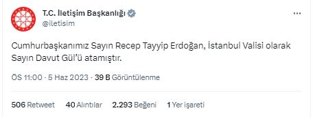 Yapılan paylaşımda: “:Cumhurbaşkanımız Sayın Recep Tayyip Erdoğan, İstanbul Valisi olarak Sayın Davut Gül’ü atamıştır." ifadelerine yer verildi. (HABER MERKEZİ)