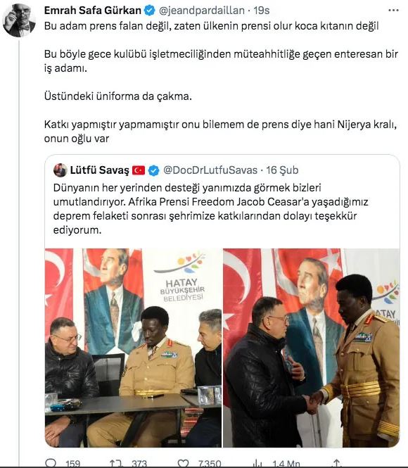 Lütfü Savaş, 16 Şubat'taki paylaşımında 'Afrika Prensi Freedom Jacob Ceasar'a yaşadığımız deprem felaketi sonrası şehrimize katkılarından dolayı teşekkür ediyorum' demişti. Emrah Safa Gürkan, o fotoğraf karesindeki kişinin prens olmadığını belirtirken üstündeki üniformanın bile çakma olduğunu sözlerine ekledi.