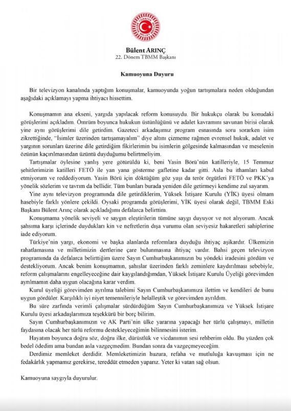 Bülent Arınç, tartışmaların ardından YİK üyeliği görevinden istifa ettiğini açıkladı.