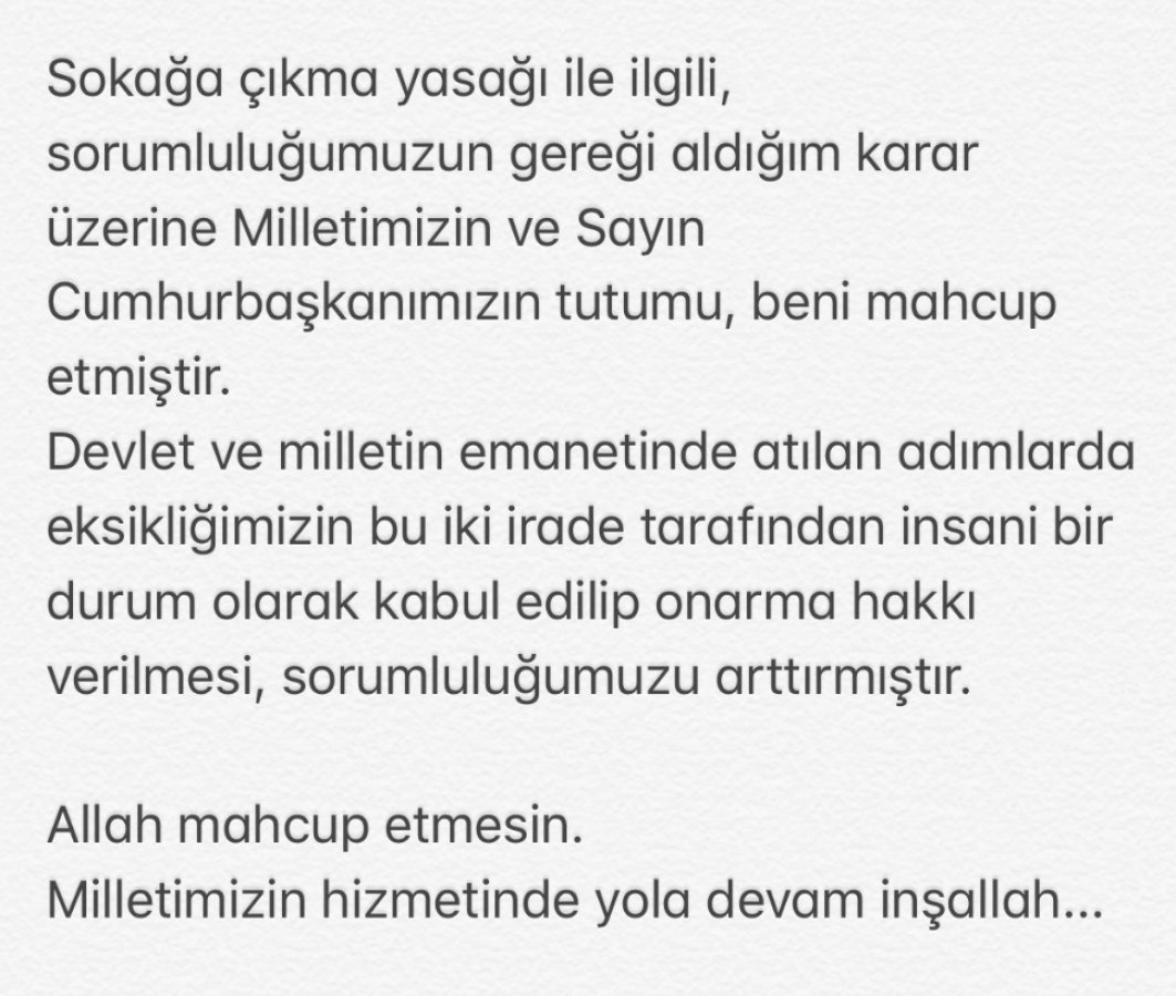 Bakan Süleyman Soylu, açıklamasında "Sokağa çıkma yasağı ile ilgili, sorumluluğumuzun gereği aldığım karar üzerine Milletimizin ve Sayın Cumhurbaşkanımızın tutumu, beni mahcup etmiştir. Devlet ve milletin emanetinde atılan adımlarda eksikliğimizin bu iki irade tarafından insani bir durum olarak kabul edilip onarma hakkı verilmesi, sorumluluğumuzu arttırmıştır. Allah mahcup etmesin. Milletimizin hizmetinde yola devam inşallah..." ifadelerini kullandı.