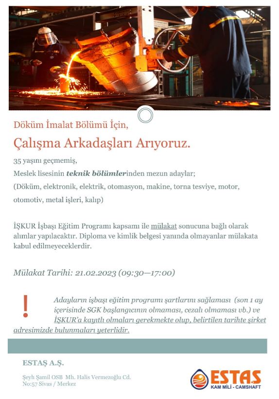 21.Şubat.2023 tarihinde devletimizin desteklerini kullanarak bir kere daha saflarımızı sıklaştıracağız. Meslek liselerinin ilgili teknik bölümlerinden elemanlar alarak üretim kapasitemizi arttırarak ülkemizin katma değerini arttırmak için bir gayret daha ortaya koyacağız.
