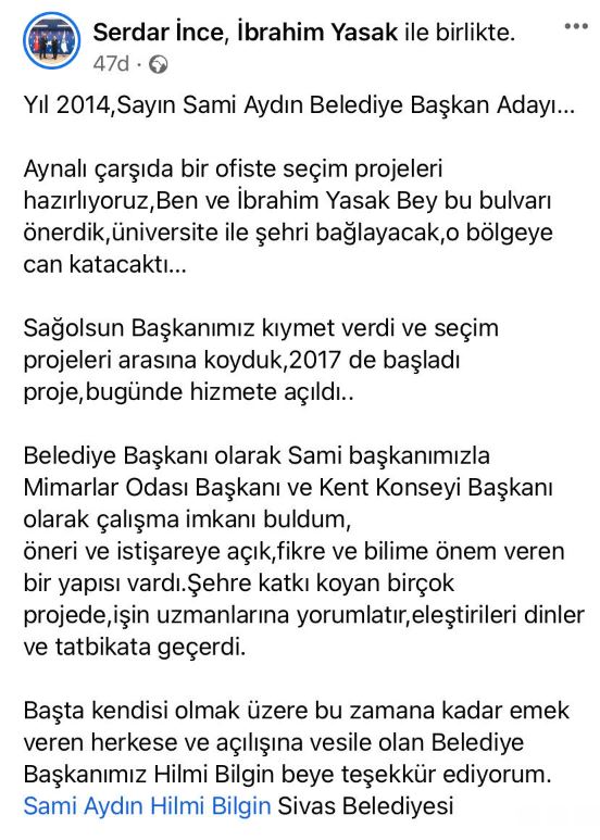Yakın zamanda açılan Recep Tayyip Erdoğan bulvarı ile ilgili sosyal medya hesabından paylaşım yapan Serdar İnce, önceki dönem belediye başkanı Sami Aydın bey ile şimdiki başkan Hilmi Bilgin beyi mi kıyasladı?