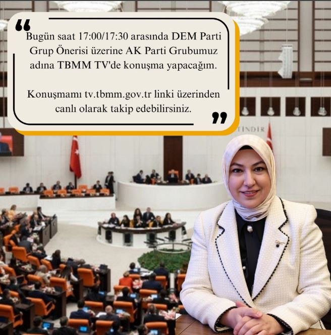 Sosyal medya hesabından yaptığı açıklamada, “Bugün saat 17:00-17:30 arasında DEM Parti Grup Önerisi üzerine AK Parti Grubumuz adına TBMM TV'de konuşma yapacağım. Konuşmamı tv.tbmm.gov.tr linki üzerinden canlı olarak takip edebilirsiniz” ifadelerini kullandı.