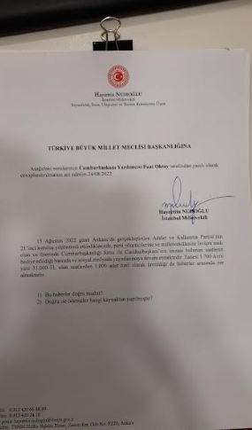 Bu bilginin doğru olup olmadığını öğrenmek için İYİ Parti İstanbul Milletvekili Hayrettin Nuhoğlu Cumhurbaşkanı Yardımcısı Fuat Oktay'ın yanıtlaması amacıyla soru önergesi verdi.