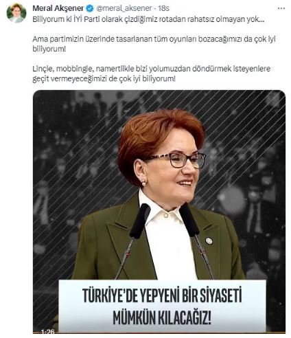 İYİ Parti'de, Genel Başkan Meral Akşener'in sosyal medya hesabından yaptığı paylaşım dikkat çekti.