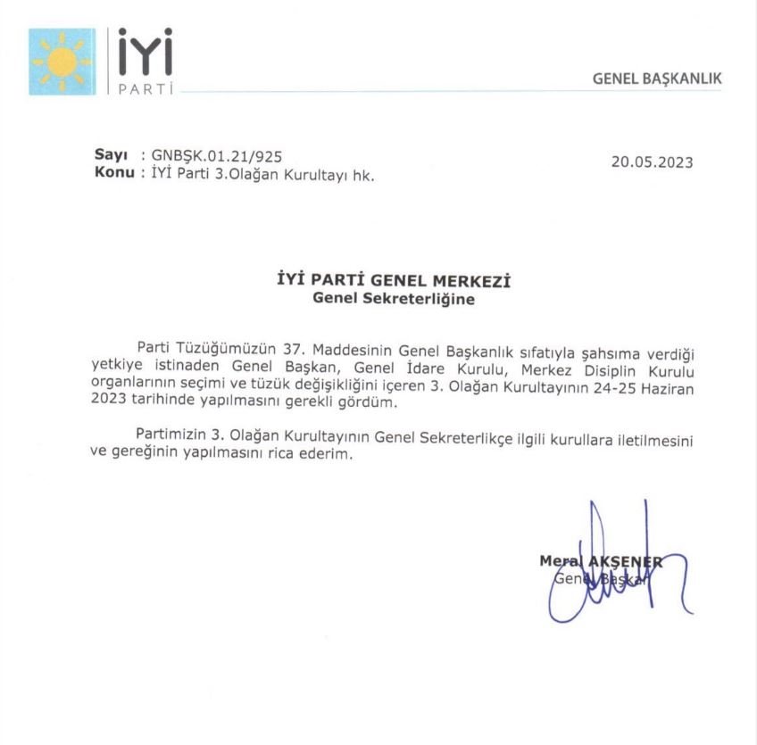 Cumhurbaşkanlığı seçiminin sonuçları beklenilmeden İYİ Parti Genel Başkanı Meral Akşener kurultay kararı verdi. (HABER MERKEZİ)
