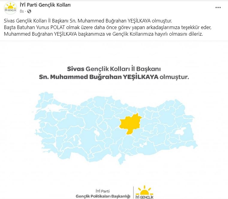 Yapılan açıklamada: "Sivas Gençlik Kolları İl Başkanı Sn. Muhammed Buğrahan YEŞİLKAYA olmuştur.