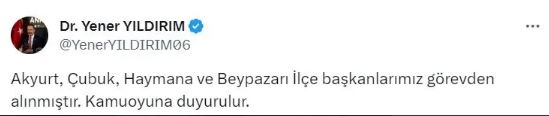 İYİ Parti Ankara İl Başkanı ve 21. dönem Milletvekili Yener Yıldırım, X hesabından yaptığı paylaşımda, Akyurt, Çubuk, Haymana ve Beypazarı İlçe başkanlarının görevden alındığını açıkladı.