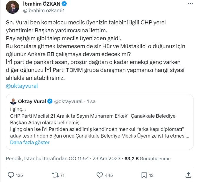 Oktay Vural'ın paylaşımını alıntılayan İbrahim Özkan ise Oktay Vural'a çocukları üzerinden vurdu. Vural'ın bir çocuğunun Ankara Büyükşehir Belediyesi'nde çalıştığını, bir çocuğunun da Vural'la birlikte İYİ Parti TBMM grubuna danışman yapıldığını açıkladı. Özkan, "Bunları hangi siyasi ahlakla anlatabilirsiniz?" diye sordu. İşte Özkan'ın o paylaşımı: