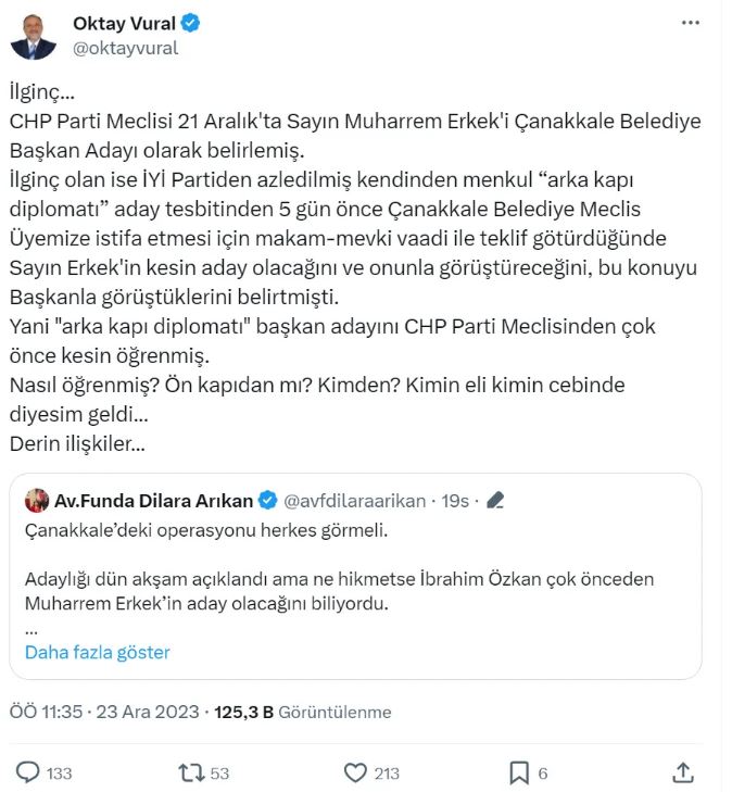 İYİ Parti Genel Başkan Yardımcısı Oktay Vural, sosyal medya hesabı üzerinden İYİ Parti'den istifa eden İbrahim Özkan'a dikkat çeken bir suçlamada bulundu. "CHP Parti Meclisi 21 Aralık'ta Sayın Muharrem Erkek'i Çanakkale Belediye Başkan Adayı olarak belirlemiş" diyen Oktay Vural, "İlginç olan ise İYİ Partiden azledilmiş kendinden menkul 'arka kapı diplomatı' aday tesbitinden 5 gün önce Çanakkale Belediye Meclis Üyemize istifa etmesi için makam-mevki vaadi ile teklif götürdüğünde Sayın Erkek'in kesin aday olacağını ve onunla görüştüreceğini, bu konuyu Başkanla görüştüklerini belirtmişti." dedi.