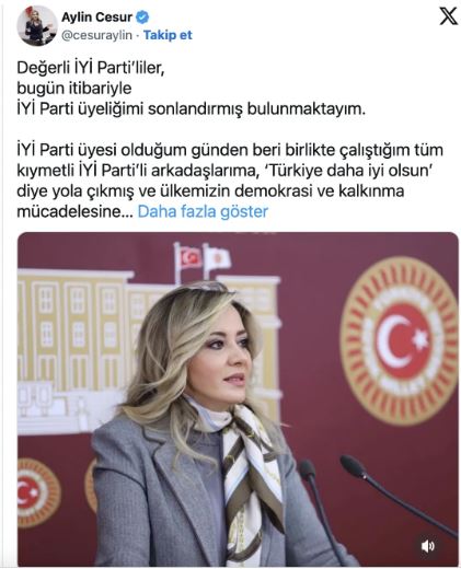 Aylin Cesur, yaptığı açıklamada İYİ Parti'deki üyeliğini sonlandırdığını belirterek, partideki tüm çalışma arkadaşlarına ve teşkilat mensuplarına teşekkürlerini iletti. İstifasını şu ifadelerle açıkladı: