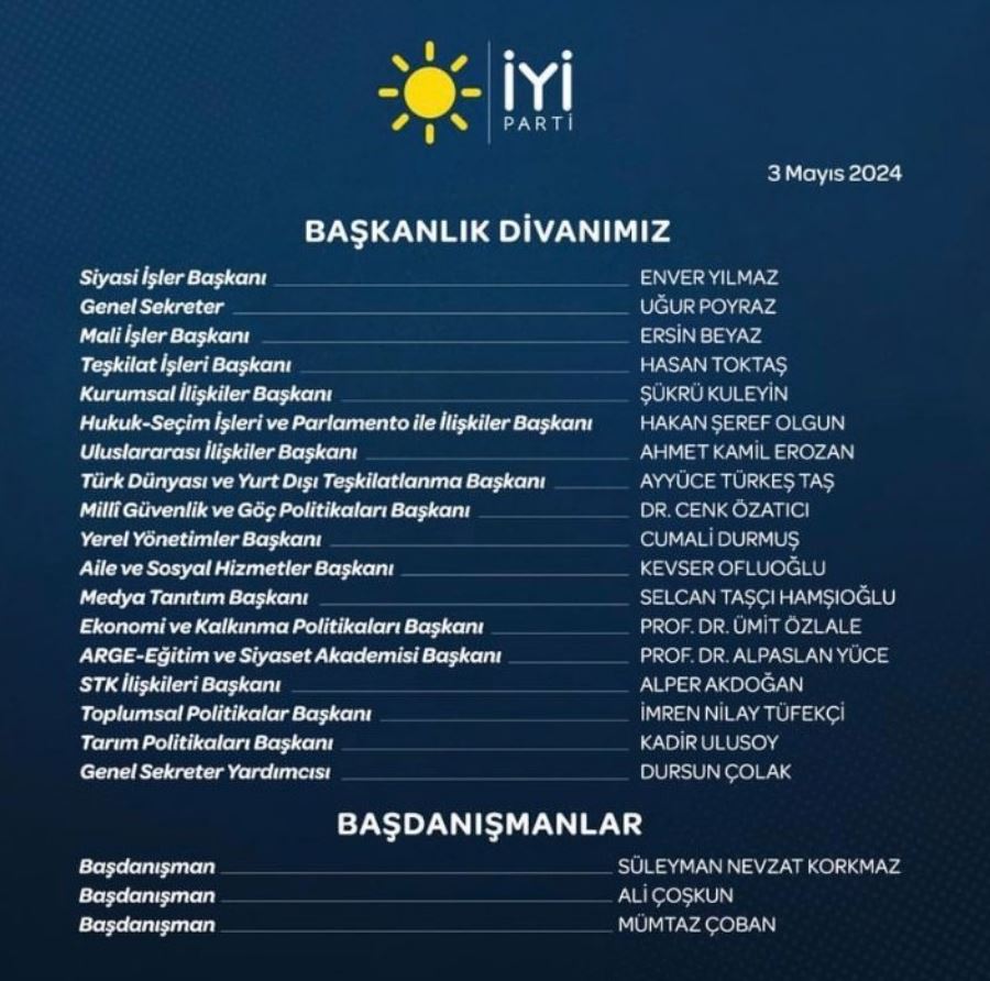 "Siyasi İşler Başkanı Enver Yılmaz, Genel Sekreter Uğur Poyraz, Mali İşler Başkanı Ersin Beyaz, Teşkilat İşleri Başkanı Hasan Toktaş, Kurumsal İlişkiler Başkanı Şükrü Kuleyin, Hukuk-Seçim İşleri ve Parlamento ile İlişkiler Başkanı Hakan Şeref Olgun, Uluslararası İlişkiler Başkanı Ahmet Kamil Erozan, Türk Dünyası ve Yurtdışı Teşkilatlanma Başkanı Ayyüce Türkeş Taş, Milli Güvenlik ve Göç Politikaları Başkanı Cenk Özatıcı, Yerel Yönetimler Başkanı Cumali Durmuş, Aile ve Sosyal Hizmetler Başkanı Kevser Ofluoğlu, Medya Tanıtım Başkanı Selcan Taşcı Hamşıoğlu, Ekonomi ve Kalkınma Politikaları Başkanı Ümit Özlale, ARGE-Eğitim ve Siyaset Akademisi Başkanı Alpaslan Yüce, STK İlişkileri Başkanı Alper Akdoğan, Toplumsal Politikalar Başkanı İmren Nilay Tüfekçi, Tarım Politikaları Başkanı Kadir Ulusoy, Genel Sekreter Yardımcısı Dursun Çolak, Başdanışman Süleyman Nevzat Korkmaz, Başdanışman Ali Coşkun, Başdanışman Mümtaz Çoban."