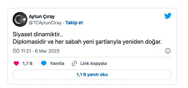 İYİ Parti İzmir Milletvekili Aytun Çıray da sabah bu yönde bir mesajl yayımladı. Çıray, Twitter’dan "Siyaset dinamiktir.. Diplomasidir ve her sabah yeni şartlarıyla yeniden doğar" paylaşımında bulundu.