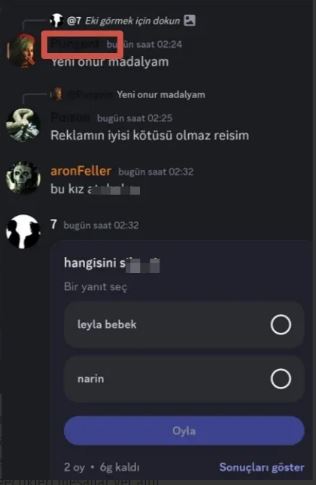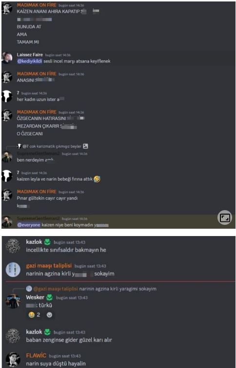 Şahsın, yönetici olarak bulunduğu Discord grubundaki mesajlar da ortaya çıktı. Grupta bulunan üyelerin, "Hangisini s....sin" başlıklı anket açıp, küçük Narin ve Leyla bebeği seçeneklere eklediği görüldü. Ayrıca Özgecan Aslan'ın ve Pınar Gültekin'in ölümüyle dalga geçtikleri mesajlar yer aldı.