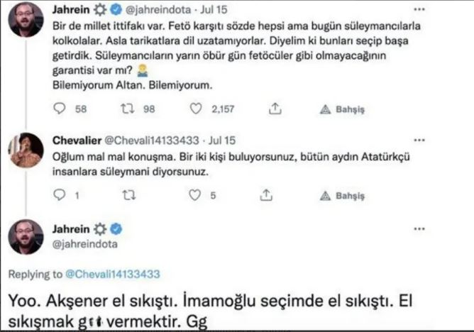 Öte yandan Jahrein ismiyle tanınan Ahmet Sonuç'un bu ilk vukuatı değil. Sonuç, 2022 yılında İYİ Parti Eski Genel Başkanı Meral Akşener'in Süleymancılarla el sıkıştığını iddia ederek, "Akşener el sıkıştı, el sıkışmak g*t vermektir" tweeti attı.