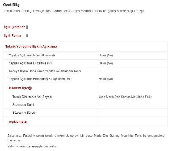 Konuyla ilgili olarak, Fenerbahçe Kulübü'nün KAP'a yaptığı açıklamada, “Şirketimiz, Futbol A takım teknik direktörlük görevi için Jose Mario Dos Santos Mourinho Felix ile görüşmelere başlamıştır. Yatırımcılarımıza saygıyla duyurulur.” İfadeleri kullanıldı.