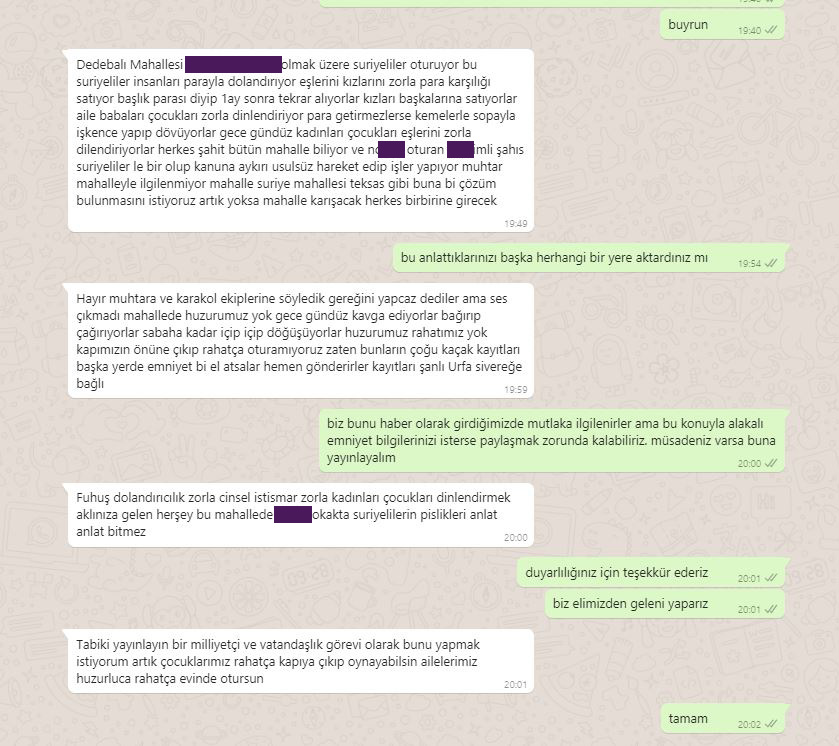 "Dedebalı Mahallesi **** Sokak NO *** olmak üzere suriyeliler oturuyor. bu suriyeliler insanları parayla dolandırıyor. eşlerini kızlarını zorla para karşılığı satıyor başlık parası diyip 1 ay sonra tekrar alıyorlar. kızları başkalarına satıyorlar aile babaları çocukları zorla dinlendiriyor. para getirmezlerse kemerlerle sopayla işkence yapıp dövüyorlar. gece gündüz kadınları çocukları eşlerini zorla dilendiriyorlar. herkes şahit bütün mahalle biliyor ve no *** de oturan *** isimli şahıs suriyeliler le bir olup kanuna aykırı usulsüz hareket edip işler yapıyor. Muhtar mahalleyle ilgilenmiyor mahalle suriye mahallesi teksas gibi buna bi çözüm bulunmasını istiyoruz artık yoksa mahalle karışacak herkes birbirine girecek.