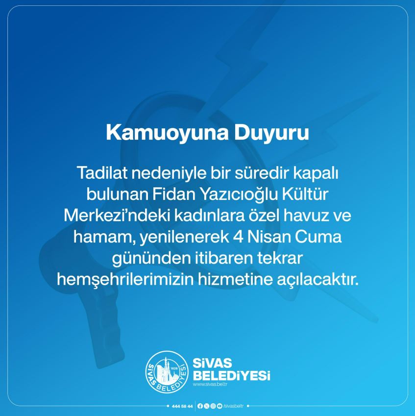 Sivas Belediyesi tarafından yapılan açıklamaya göre, tadilat nedeniyle bir süredir kapalı olan Fidan Yazıcıoğlu Kültür Merkezi’ndeki kadınlara özel havuz ve hamam, yenilenerek yeniden hizmete açılıyor.