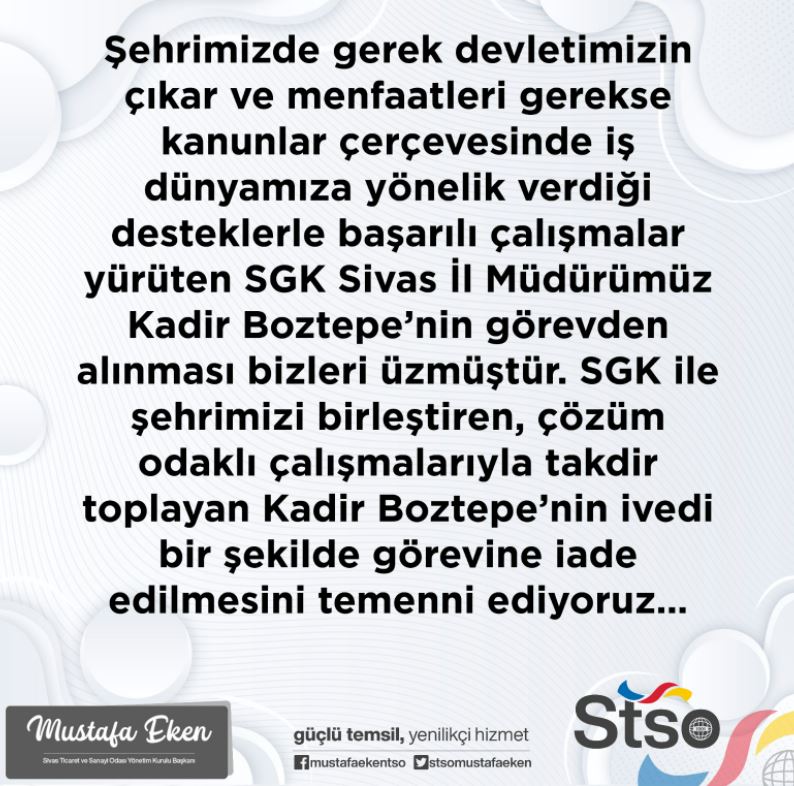 "Şehrimizde gerek devletimizin çıkar ve menfaatleri gerekse kanunlar çerçevesinde iş dünyamıza yönelik verdiği desteklerle başarılı çalışmalar yürüten SGK Sivas İl Müdürümüz Kadir Boztepe'nin görevden alınması bizleri üzmüştür. SGK ile şehrimizi birleştiren çözüm odaklı çalışmalarıyla takdir toplayan Kadir Boztepe'nin ivedi bir şekilde görevine iade edilmesini temenni ediyoruz..."