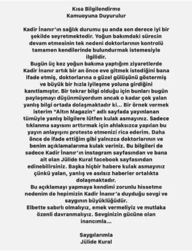 Jülide Kural, Kadir İnanır'ın sağlık durumuna ilişkin bilgilendirmelerde sadece Kadir İnanır'ın Instagram sayfasının ve Jülide Kural'ın Facebook sayfasının dikkate alınmasını isteyerek, "Bu açıklamayı yapmaya kendimi zorunlu hissetme nedenim de hepimizin Kadir İnanır'a duyduğu sevgi ve saygının büyüklüğüdür. Elbette sabırlı olmalıyız, emek vermeliyiz ve mutlaka özenli davranmalıyız. Sevginizin gücüne olan inancımla..." dedi.