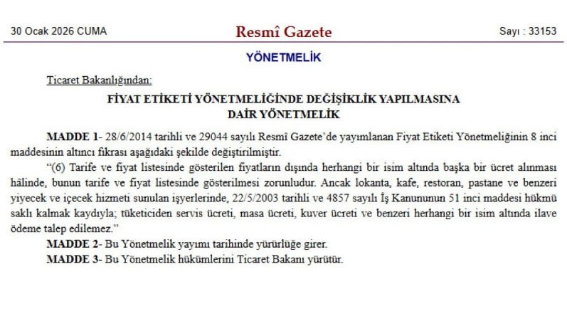Ticaret Bakanlığı tarafından hazırlanan ve restoran ile kafelerde servis ve kuver ücretini yasaklayan yönetmelik değişikliği Resmi Gazete’de yayımlanarak yürürlüğe girdi. Kararla birlikte, işletmelerin tarife ve fiyat listelerinde yer almayan herhangi bir ücretin tüketiciden talep edilmesi engellendi.